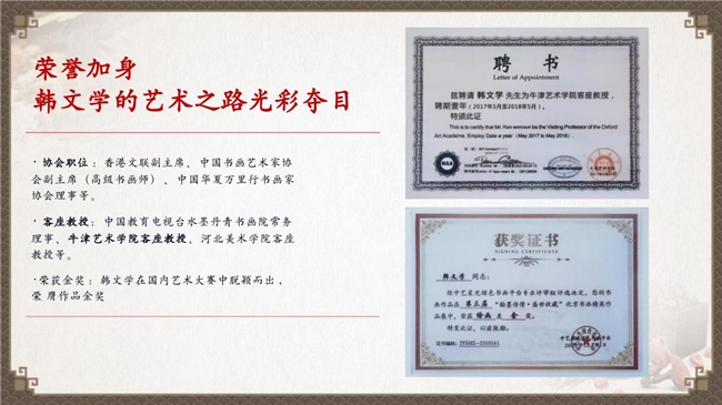 2017年英国牛津市圣埃德蒙学院礼堂内掌声阵阵,一场承载着东西方艺术对话意义的聘任仪式在此举行 —— 中国实力派书画家、退伍军人韩文学先生正式被牛津艺术学院授予客座教授聘书。这是该学院当年 “东方艺术研究计划” 中,首次为中国传统书画领域艺术家颁发这一学术头衔,标志着中国当代书画艺术的传统传承与创新实践,获得国际顶尖艺术教育机构的高度认可。